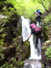 懸念していた雨が降り始める。行動中はさして気にならないが、やや寒くなってきた。水に入るのはためらってしまう。5m+3mのゴルジュでは手間を食ったが、それ以降は快適な遡行となる。トイ状の滝をまたいで通過したり、ややスリリングなへつりをしたり、シャワー気味に登ったり・・・と楽しめるところだ。登れない滝も、巻きが小さいので苦にならない。