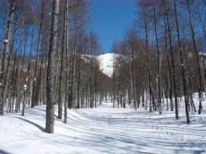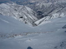 尾根上は太陽が良く当たるのか、雪が腐っていて滑りにくかったが、沢に入ったら雪質が良くなった。斜面はやや北向きなので、太陽が当たっていても角度が浅いので、雪が腐っていないようだ。ここのところの陽気で、しばらくパウダーから見放されていたので、久しぶりの快適なパウダーに思わず声が出てしまった。パウダーの区間はそんなに長くはなく、下のほうに降りるにつれて雪は腐っていった。でも、少しの間だけでもパウダーを滑れただけで、今日の山行は満足したと思えてしまう。