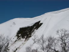 平標の山頂からこの尾根までの間は、沢側にはブッシュが密集しており、滑り込むポイントがない。その尾根通しに少し滑ったあと、潅木をやり過ごして沢へと滑り込む。 |