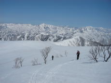 駒の小屋まで波々で滑りにくい大斜面を滑り、そこから先の痩せ尾根は右の沢に滑り込む。この斜面は気持ちよかった。でも、調子に乗って滑ると登り返しになるので、数ターンに抑えてトラバースして尾根に復帰。ここから道行山までは、登って来たルートを忠実に滑る。道行山への登り返しは、面倒だったがシールをつけた。道行山で少し休憩して、最後の大展望を満喫する。太陽が斜になって、光と影のコントラストが素晴らしい。