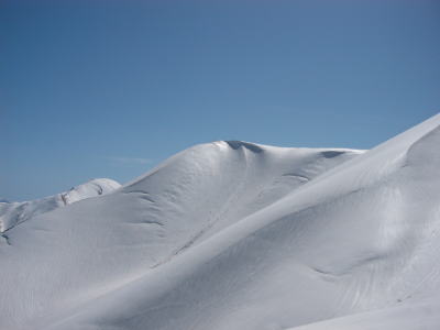 さて、いよいよ下り。そうそう、今日は新兵器で来ていたのだ!フォルクルの板を新調。来シーズンのパウダー用で買ったけど、来シーズンまで待ちきれずに持ってきてしまったのだ。ビンディングングの位置がかなり前なのが気になった。後ろがやたら長いので、結構滑りにくい。最初のターンは大変怖く勇気がいったが、すぐに感触をつかむことができた。でも、時々なんか引っかかって、前触れもなく大転倒することも多かった。