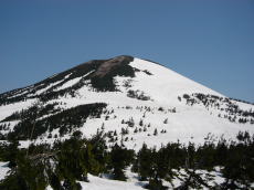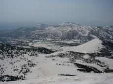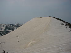緩〜い登りをひたすら大岳目指して歩く。だんだんと大岳が近づいてくる。なんだか楽勝に思えてきて、これなら大岳だけ登るのはもったいない、硫黄岳と小岳も登れるかもしれない。1時間ほどで大岳と硫黄岳のコルへと登る地点に着く。ここで小休止。ひと登りで大岳と硫黄岳のコルにある仙人岱ヒュッテに着いた。 ここから大岳の登りになる。酸ヶ湯方面から登って来たと思われる、ゲレンデスキーを背負った人が大岳に取り付いていた。登るにつれて強かった風がさらに強くなってきた。突風の時はあおられるので、スキーを踏ん張って耐える。そのうち耐え切れなくなり、風に弱いT世さんは山頂を断念して、ひとり下ることになった。一人で山頂に向かうことになるが、断念した地点からわずかで山頂のお釜のふちに着いた。頂稜の内側は無風だったが、山頂は大風が吹き荒れていた。9時ごろということで、決して早い時間ではないと思うが、山頂には誰もいなかった。T世さんが仙人岱ヒュッテで待っているので長居はできない。休憩はほどほどに滑降準備。