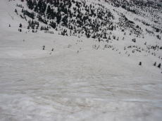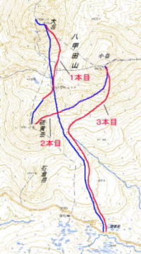 いよいよ滑り。風の影響か、まだ朝早いからか、素晴らしい斜面に見えた大岳のからの斜面は滑りにくい・・・。ターンにかなり雪の抵抗を感じた。後ろ足がカクンと抜けて2度転倒。なんだかやる気がなくなって、ヒュッテまでただ滑っただけみたいになってしまった。
