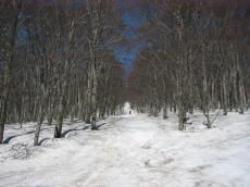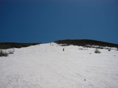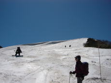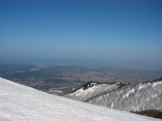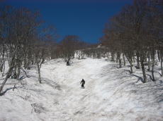 駐車場からリフトに乗り、そこから歩くこと30分くらいで長平コースの滑降地点へ。緩い斜面を少し滑ると、いい斜度の斜面!そして、眼下に海が!でも、良く見ると斜面はシュプールで荒れ放題。しかも、滑ってみると硬い・・・。いい斜度の斜面はここだけ。あとは斜面というよりも尾根となり、下っていくだけって感じになる。そして、なんだかあっという間に鯵ヶ沢スキー場のTOPに出てしまった。もう終わり・・・?あとはターンすると止まりそうになるゲレンデを延々とベースまで滑るのみだった。長平コースは標高差1000m以上あるのだが、楽しめるのは上部のほんのひと滑りのみ。あっけなく終わってしまった。