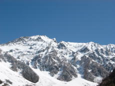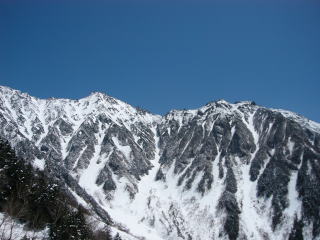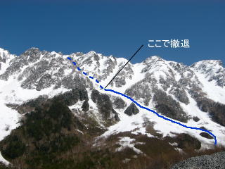 前日の冷たい雨は高い山では雪だったようで、しかもこの時期としては結構な量が降った。朝は新雪のままだったが、登っているうちにあちこちから雪崩れ、とうとう滑るところがなくなってしまった。まだ雪崩れる可能性もあったので、ここは大事をとって撤退することに。ただ、この新雪のおかげで、茶色い雪が真っ白に戻り、純白の穂高連峰のパノラマを満喫することができた。新雪が降らなければ雪崩れはないし、雪質も快適ザラメ。降ると景色がよくなる。天は二物を与えず・・・ってとこか。