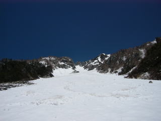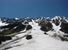 さあ、滑降だ!といきたいとこだが、登って来た斜面はほとんどがデブリで埋められている。デブリとデブリの間のわずかな斜面を縫って滑る。重くベッタリとした雪。下部は硬くて荒れたザラメ。最近の快適ザラメで上手になった気でいたが、ちょっと条件が悪くなるとボロが出まくりだ。どんな雪でも対応できるように、もっと練習しなければ・・・・。あっという間に出合いまで滑り降りる。あとはダラダラと登山道を下るのだが、やたら長く感じて苦痛だった。 途中撤退ということになってしまったが、今回のテーマの中には岳沢流域の下見というのもあったので、その点では収穫はあった。西穂高岳側の沢は他にも興味のある沢(天狗沢、間ノ沢など)があり、前穂側の奥明神沢も狭いけど滑れそうだ。来年は岳沢の雪渓がもう少し下まで残っている時期に、定着で臨みたいと思った。