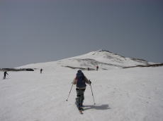 登り始めると、どんどんと山頂が近づいてくる。近くなるだけで景色はあまり変わらないので、カメラを出す回数は少ない。遠くの山は霞んでるし・・・。風が強いのも少々気になるところだ。山頂直下の急斜面では、その風のせいでか斜面が硬くなってきた。シールが効かないほどではなかったが、滑ることを考えると快適ではないような・・・。 |