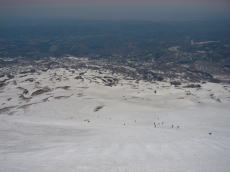 とにかく前も後も右も左も斜めも人人人!!!ひと塊何十人がいったいいくつあるのだろう・・・。ざっと数えただけでも200〜300人以上は間違いなくいる。その中でも他の山に比べてテレマーカーが異常に多い。あとゲレンデスキーを背負った人もたくさん。さすが鳥海!