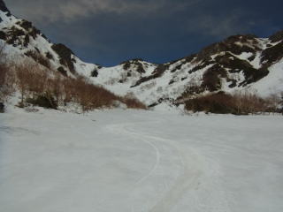 最初の急斜面とその後続く快適な斜面を滑ったところで切り上げるのが妥当かな。そうすれば登り返しは300m、時間にすれば1時間弱で済むはず。何度も滑りたいルートではないが、一度は行っておいて損はないと思う。 |