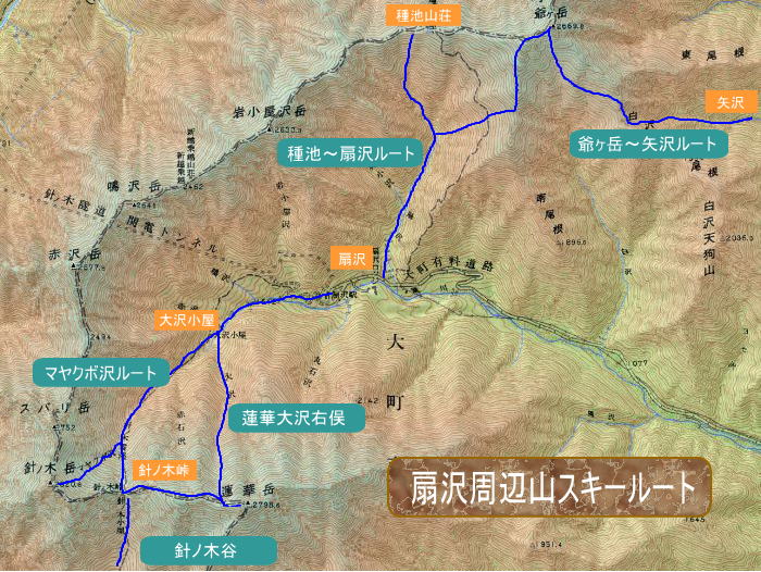 滑り出しこそ広くて緩めだが、徐々に傾斜が増し、吸い込まれるように谷へと入る。二俣あたりが最大斜度。ノドに突入すると落石混じりとなるが、スリルのある滑りが続く。左俣を合わせると広くなり、あとは大沢小屋まで流す。 |