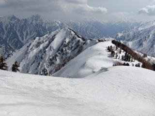カールが終わると急に谷が狭まり一気に落ち込む。この谷通しも滑ることはできるが、右の尾根を乗り越せば内蔵助名物の巨大一枚バーンを滑ることができる。この一枚バーンは幅も標高差も500mはあるというスケールの大きな斜面。少し斜度があるので雪質が悪ければ苦労するが、広いので安心して滑ることができる。